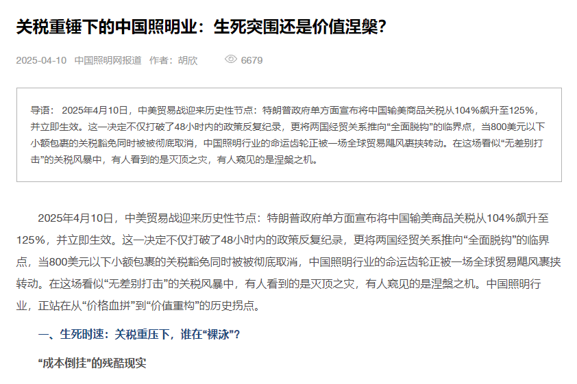 2025年4月10日,中美贸易战迎来历史性节点:特朗普政府单方面宣布将中国输美商品关税从104%飙升至125%,并立即生效。这一决定不仅打破了48小时内的政策反复纪录,更将两国经贸关系推向“全面脱钩”的临界点,当800美元以下小额包裹的关税豁免同时被被彻底取消,中国照明行业的命运齿轮正被一场全球贸易飓风裹挟转动。在这场看似“无差别打击”的关税风暴中,有人看到的是灭顶之灾,有人窥见的是涅槃之机。中国照明行业,正站在从“价格血拼”到“价值重构”的历史拐点。
